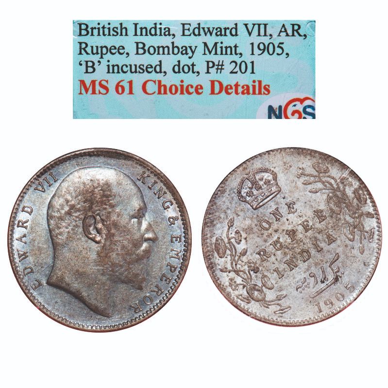 Edward VII, Silver, Rupee, 1905, Bombay Mint, 'B' incused and dot, Top stroke of numeral 5 long, 11 o'clock on Rev. F. Prid 201. GK 936. NGS Slabbed MS 61. Rare.