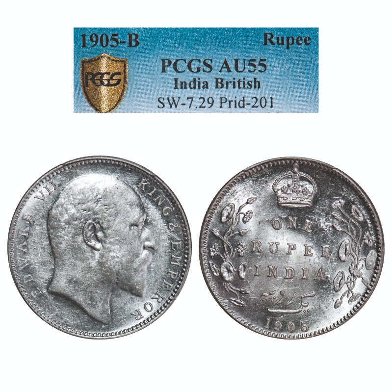 Edward VII, Silver, Rupee, 1905, Bombay Mint, 'B' incused and dot, top stroke of numeral 5 long. F. Prid. 201. GK 936. PCGS Slabbed AU 55. Very Scarce.