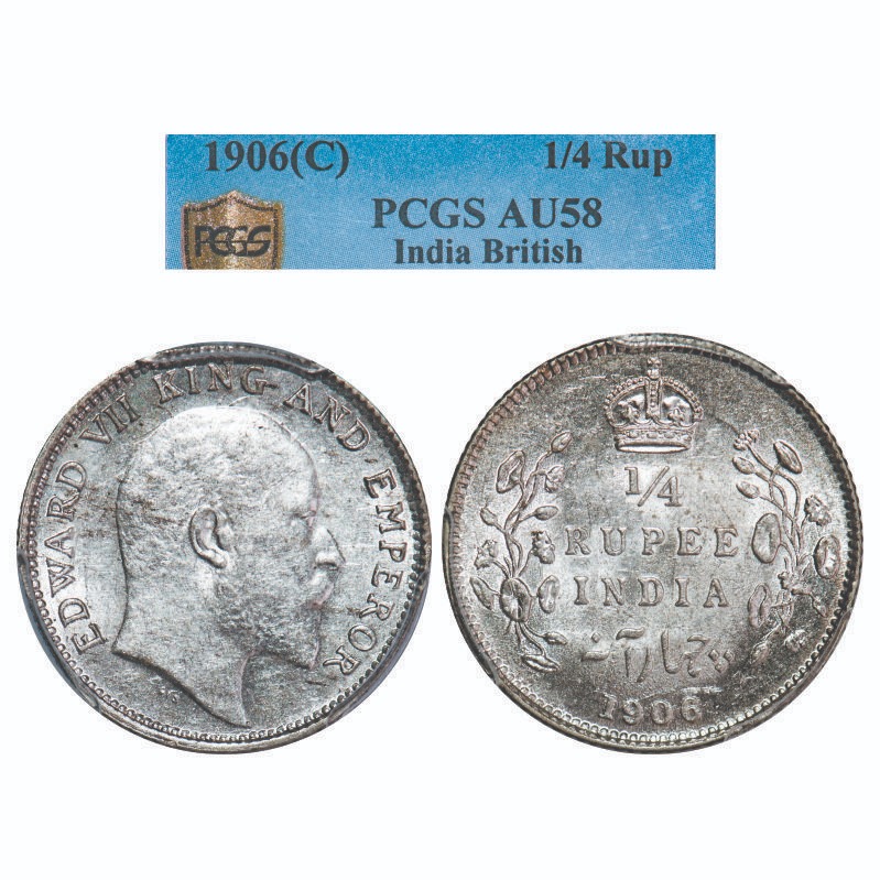 Edward VII, Silver, 1/4 Rupee, 1906, Calcutta Mint, No mint mark. F. Prid 435. GK 975. PCGS Slabbed AU 58. Very Scarce.