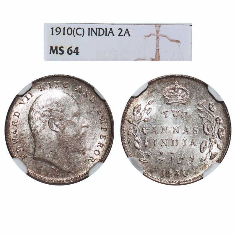 Edward VII, Silver, 2 Annas, 1910, Calcutta Mint, No mint mark. F. Prid 563. GK 987. NGC Slabbed MS 64. Very Rare.