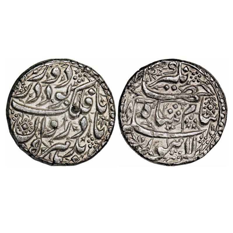 Jahangir, Silver Heavy Rupee, 14.24g, 25% overweight hence known as 'Sawai' Rupee, AH (10)18/5 RY, Lahore Mint, Ta Falak couplet, reads as Badhar Bad Rawaan Ta Falak, Buwad Dar Daur Baname Shah Jahangir, Sikka-i-Lahore that is 'In the world so long the heavens revolve may current be in the name of Shah Jahangir, the money of Lahore'. KM 158.5. Extremely Fine+, Very Rare. |