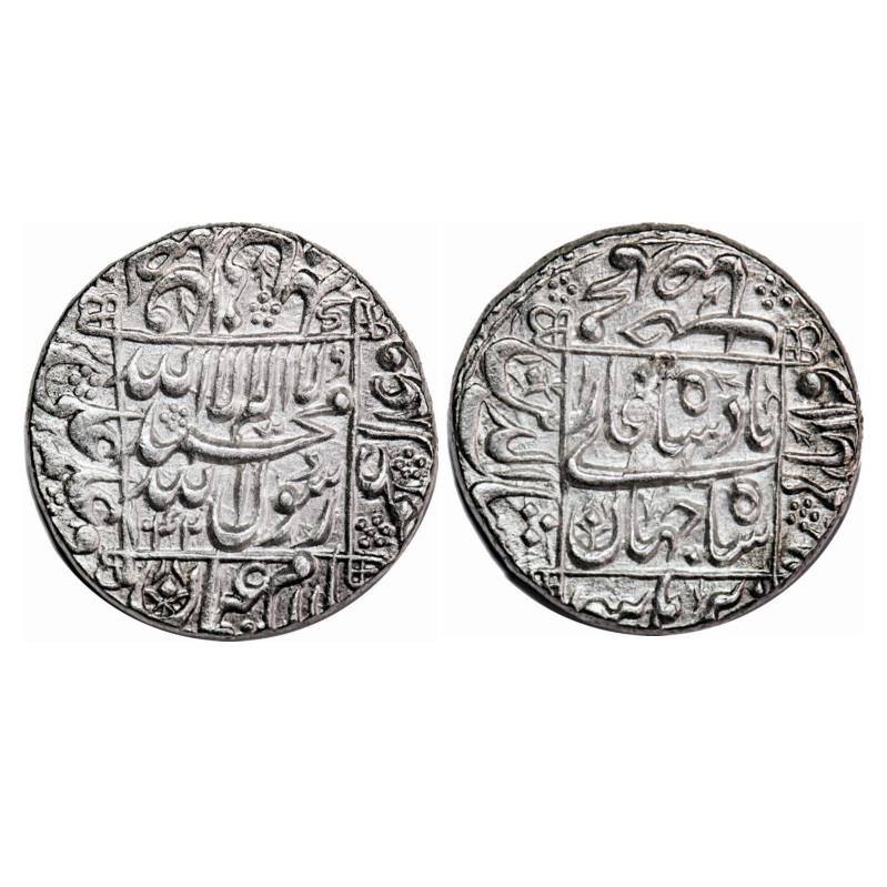 Shah Jahan I, Silver Rupee, 11.46g, Burhanpur Mint, AH 1042 RY, legend within square area on both sides with near complete die impression, complete mint visible in bottom. KM 235.3. Extremely Fine+, Very Scarce.