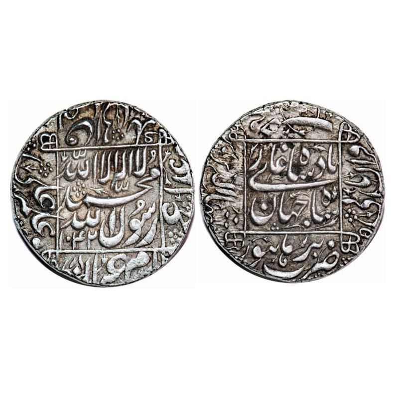 Shah Jahan I, Silver Rupee, 11.44g, Burhanpur Mint, AH 1042/5 RY, square area type, kings title and complete mint at bottom margin of reverse, a complete center struck coin. KM 235.9. Extremely Fine, Very Rare. |
