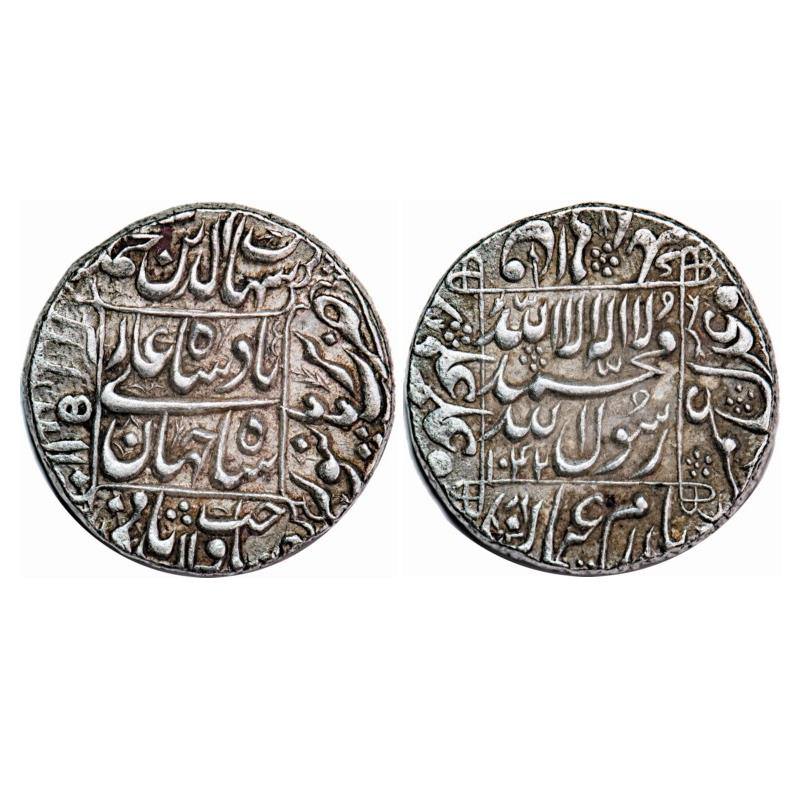 Shah Jahan I, Silver Rupee, 11.44g, Burhanpur Mint, AH 1042/5 RY, square area type, with Khallada Allah Mulkahu on left margin and complete mint on right margin of reverse, a complete center struck coin. KM 235.33. Extremely Fine, Very Rare. |