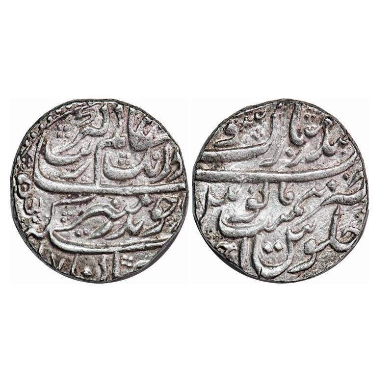 Aurangzeb, Silver Rupee, 11.46g, Bandar-i-Mubarak Surat Mint, AH 1070/Ahd, Almost complete mint name and epithet on rev. top. KM 300.85. Mint State, Scarce.