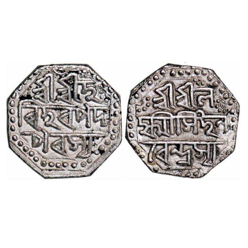 | Assam, Octagonal Silver Half Rupee, 5.66g, Lakshmi Simha (1770-80), undated, Assamese legends in three lines, with invocation to Siva, Obv: Sri Sri Ha/ri Hara Pada/ Parasya, with dot in crescent on top, Rev: Sri Sri La/ksmi Simha Na/ rendrasya. Reverse die perfectly struck at 6 o'clock. (A.Mitra. 295, RB. Q 35.1 type). About Very Fine, Rare. |