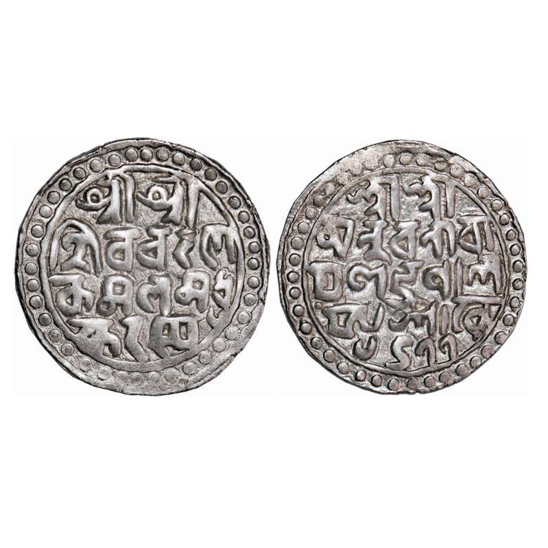 | Cooch Behar, Silver Tanka, 10.46g, Nara Narayan, SE 1477, Obv: Sri Sri/Siva Charana/Kamala Madhu/Karasya, Nagari legend type, with,'Si', 'Ra', 'Na' of Shiva charana in nagari legend, Rev: Sri Sri/man Naranara/yana Bhupala/sya Sake 1477. Rhodes/Bose A-2.4 type. About Extremely Fine, Very Scarce. |