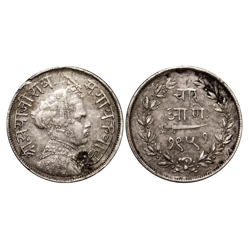 Baroda, Silver 4 Annas, 2.83g, Sayaji Rao III, VS 1951, Portrait of Sayaji Rao on obverse. KM Y34a. Very Fine, Scarce.