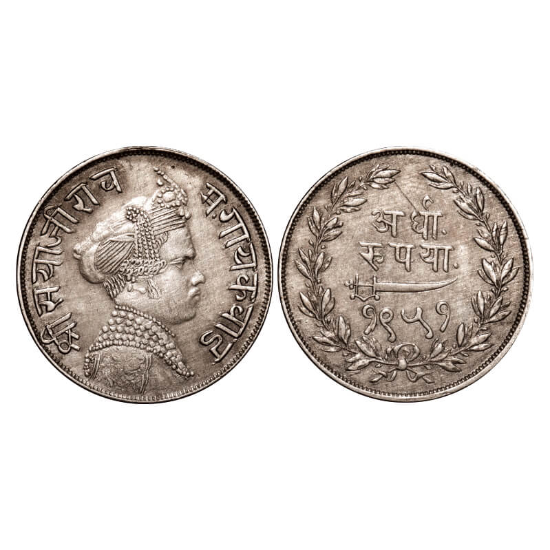 Baroda, Silver ½ Rupee, 5.66g, Sayaji Rao III (AH 1292-1357 / 1875-1938 AD), VS 1951. KM Y35a. Toned About Extremely Fine, Rare.