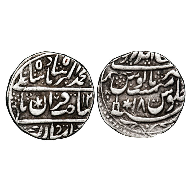 | Bharatpur, Silver Rupee, 11.03g, Randhir Singh (AH 1220-1239/1776-1805 AD), INO Muhammad Akbar II, Braj Indrapur Mint, AH 1293/18 RY, broad flan. KM 106a. Very Fine, Scarce. |