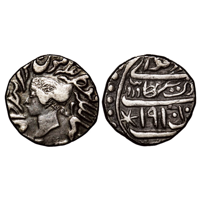 | Bharatpur, Silver Rupee, 11.07g, Jaswant Singh (AH 1269-1311 / 1853-1893 AD), Braj Indrapur Mint (Dig), VS 1910/1858(inverted) AD, INO Queen Victoria, Obv: Profile bust of the Queen wearing a coronet in centre; Farsi legend Malika Mu'azzamah Farman Rawaye Inglistan ("Mighty Queen Ruling Over England"), date below. Rev: Farsi legend Sikka-i-Zul Iqtidar Angrezi Sarkar (Coin of the upholder of the trust of the English Government) Zarb Brajindrapur followed by mint-marks of (star and dagger) and VS date. KM 176. Very Fine, Rare. |