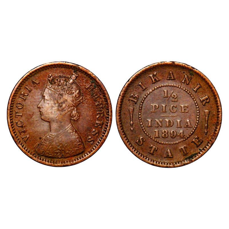 Bikanir, Copper ½ Pice, 3.24g, Ganga Singh, 1894 AD, with the name and portrait of Victoria Empress. KM 70/PR 1011. Fine+, Scarce.