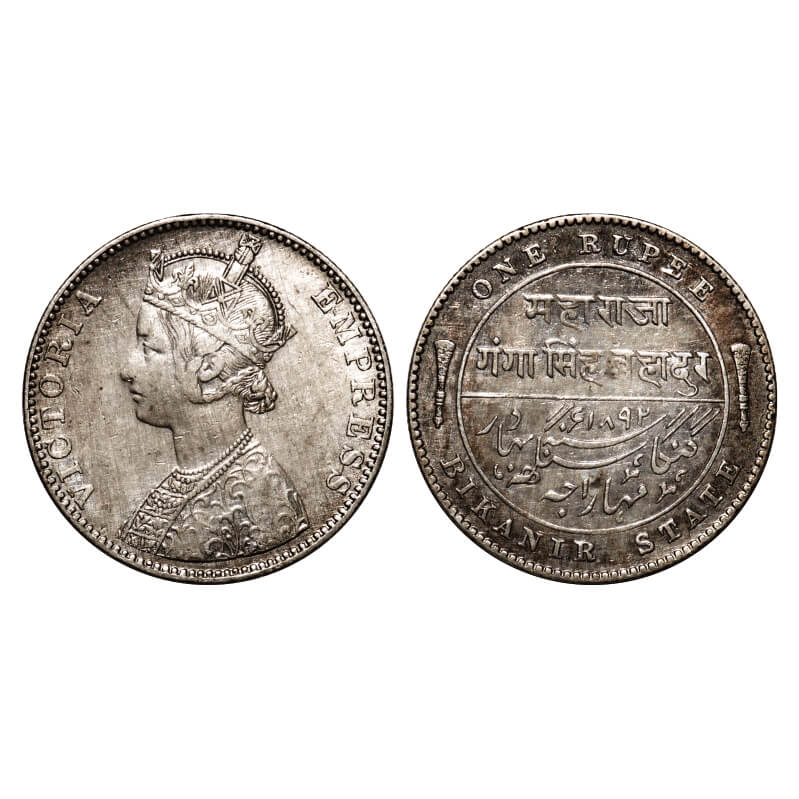 | Bikanir, Silver Rupee, 11.56g, Ganga Singh, 1892 AD, Bombay Mint, Portrait of Victoria Empress, Milled coinage. KM 72. Very Fine, Scarce. |
