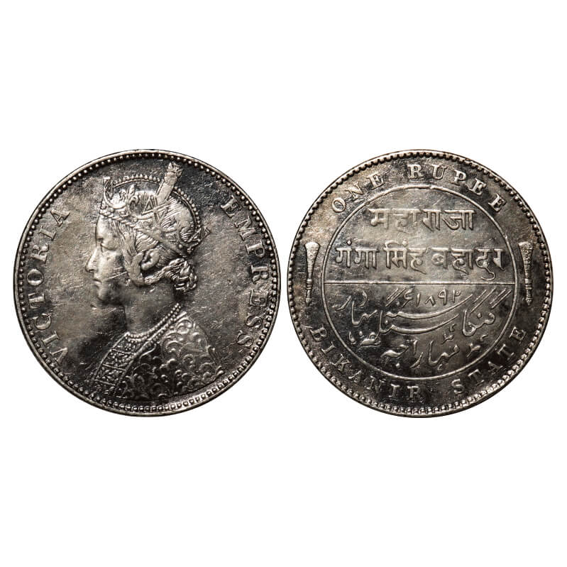 | Bikanir, Silver Rupee, 11.54g, Ganga Singh, 1892 AD, Bombay Mint, Portrait of Victoria Empress, Milled coinage. KM 72. Very Fine+, Scarce. |