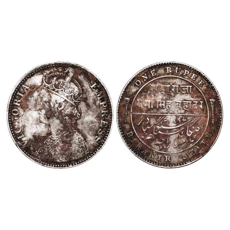 | Bikanir, Silver Rupee, 11.71g, Ganga Singh, Bombay Mint, AD 1897, Portrait of Victoria Empress, Milled coinage. KM 72. Toned About Very Fine, Scarce. |