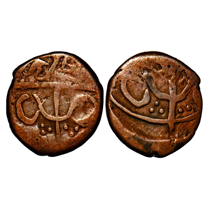 Chamba, Copper Paisa, 4.98g, Sri Singh (1844-1870 AD), trident and nagari legend on both side, die shift error. KM 10 type unlisted denomination. About Very Fine, Rare.