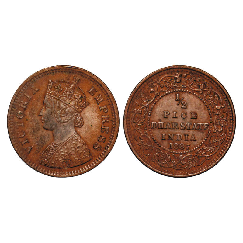 Dhar, Copper ½ Pice, 3.18g, Anand Rao III, AD 1887, bust of Victoria Empress on obv. KM 12. Very Fine+, Rare.