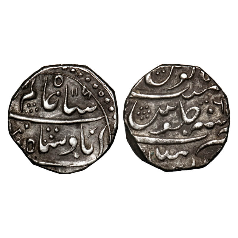 Gwalior, Silver Rupee, 11.21g, Dar ul Islam Mandasor Mint, AH 1171(unsual style of date)/2 RY, INO Shah Alam II. KM unlisted. About Extremely Fine, Very Rare.