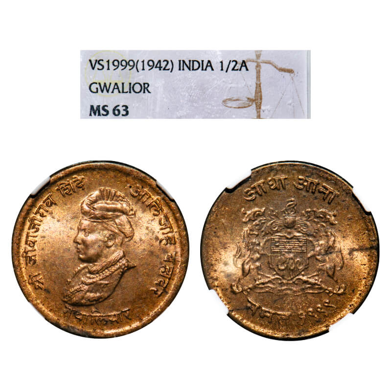 Gwalior, Brass ½ Anna, Jivaji Rao, Bust of Jivaji Rao on obv, VS 1999 (1942). KM 179.2. About Very Fine, Scarce. NGC graded MS 63. Very Scarce.