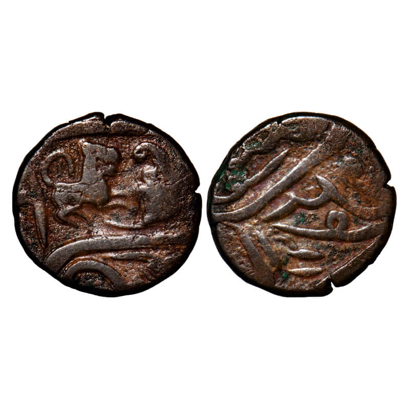 Indore, Copper Paisa, 13.61g, Vagh Rajas, (Mahidpur). Lion towards right in front of leaf, reverse retrograde legends. KM Unlisted. Very Fine, Scarce.