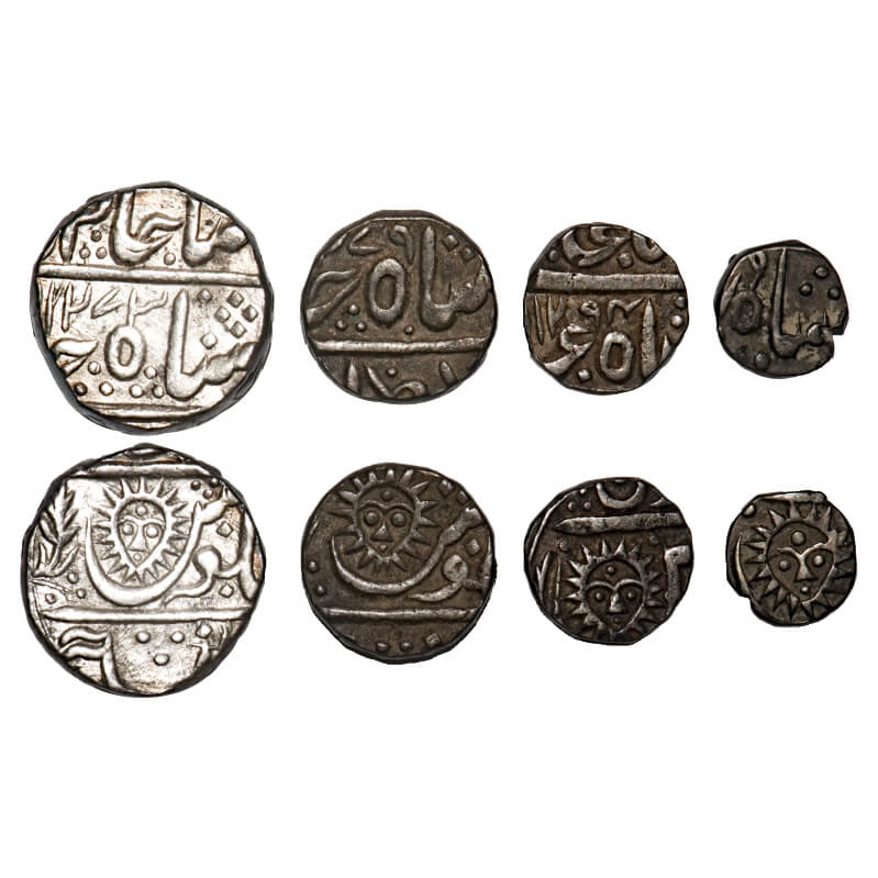 | Indore, Silver Rupee, ½, ¼ & 1/8 Rupee (4 Coins), Malharnagar Mint, INO Shah Alam II, AH 1273, 1279, 1294, (127)9, sunface type. KM 76, 73, 72, 71. Very Fine, Scarce. |