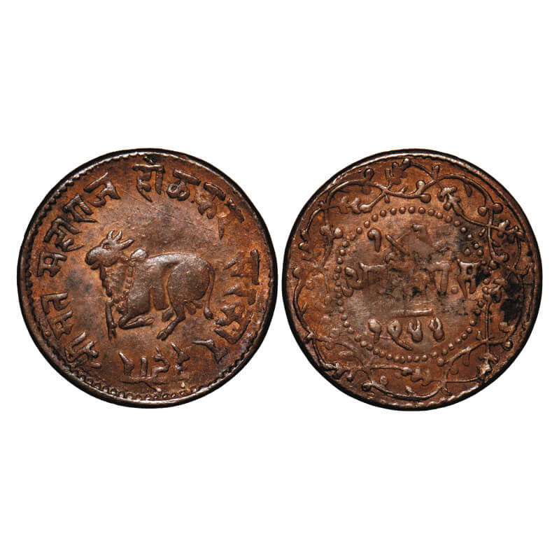Indore, Copper ½ Paisa/Adhela, 3.44g, Shivaji Rao (VS 1943-1960 / FE 1296-1313 / 1886-1903 AD), Obv: Reclining bull to left and king's title around, Rev: dhela San 1944 (1887 AD) in 2 lines. KM 30.1. About Very Fine, Very Scarce.