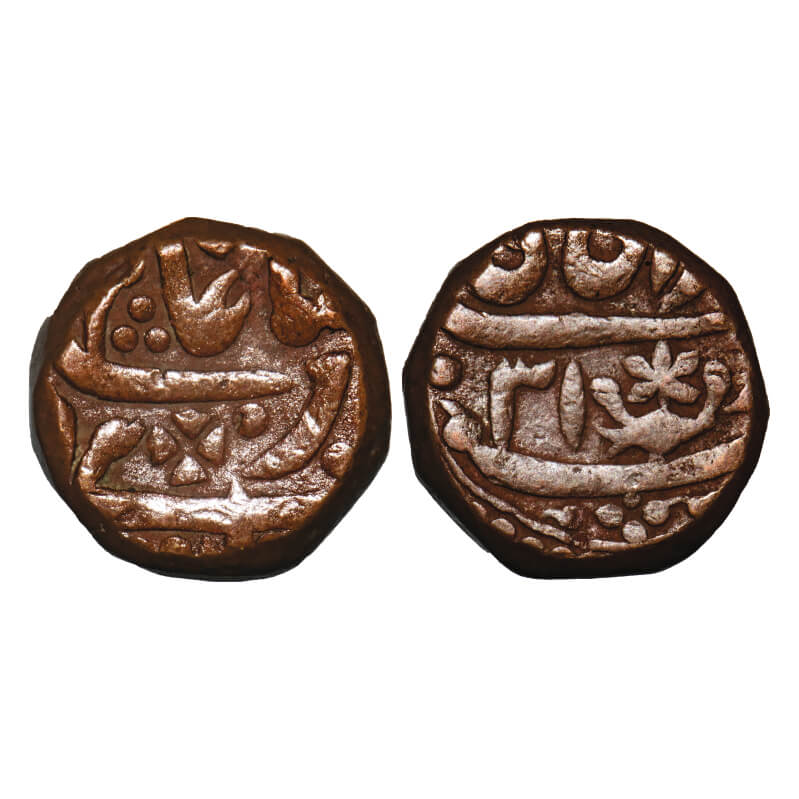 Jaipur, Copper Paisa, 18.74g, Sawai Jaipur Mint, INO Shah Alam II, 28 RY, different Fish below flower as mint mark. KM 37 type unlisted. Very Fine, Very Scarce.