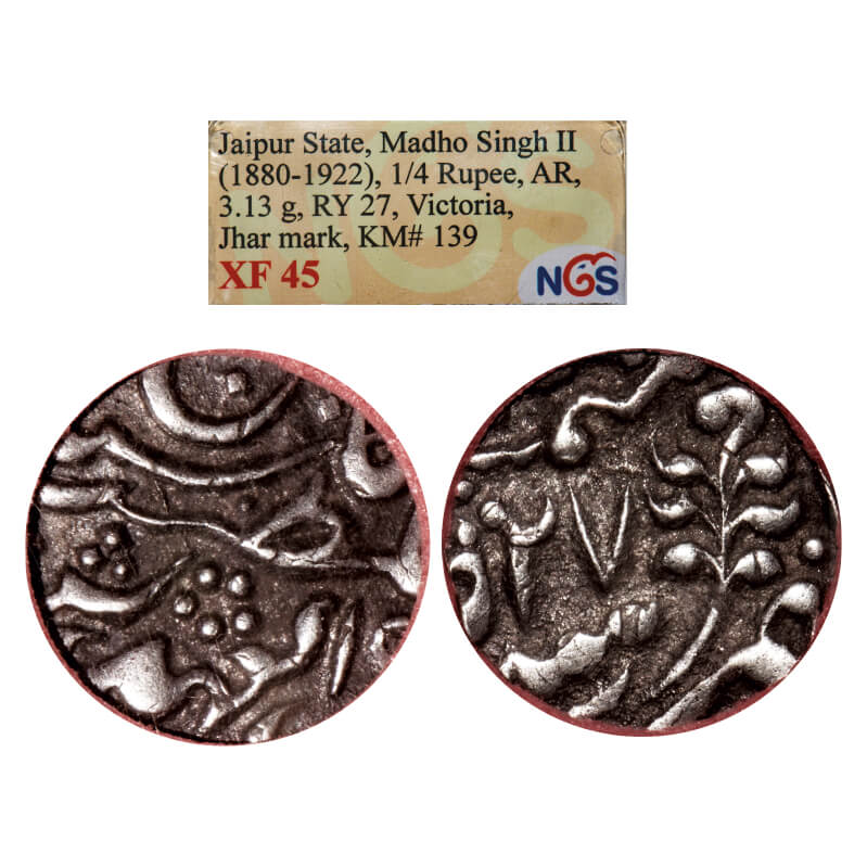 Jaipur, Silver 1/4 Rupee, 3.13g, Madho Singh II (AH 1298-1341 / 1880-1922 AD), INO Victoria, RY 27. KM 139. NGS graded XF 45, Very Scarce.