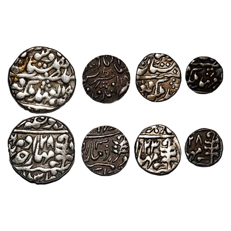 | Jaipur, Silver (4 Coins), 1/4 Rupee 30 RY, early coinage, Rupee 28 RY, 1/4 Rupee 23 RY, 1/8 Rupee 28 RY, Madho Singh II (AH 1298-1341 / 1880-1922 AD), INO Victoria, KM 111, 145, 139,137. Very Fine. Very Scarce. |