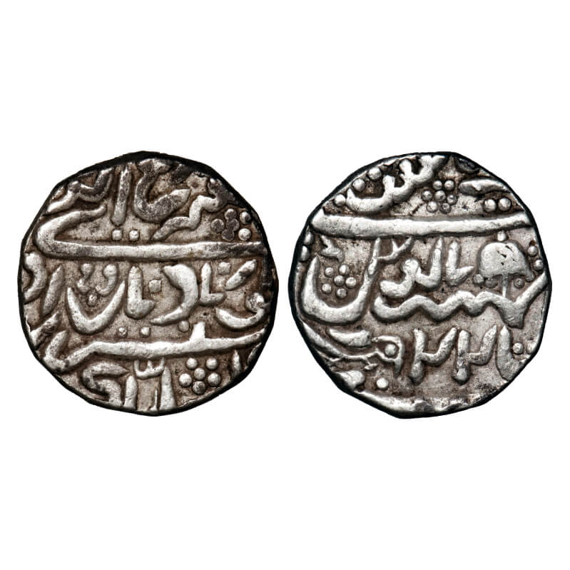 | Jaisalmir, Silver Rupee, 10.43g, Ranjit Singh (1846-1864 AD), Akhey Shahi, 22 RY Frozen, Dar ul Khilafat Shahjahanabad Mint, INO Queen Victoria, with mark '17' on obverse above 'Nun' of farman with bird and umbrella on reverse. J. Lingen 3.13.04 N 4. Very Fine, Very Scarce. |