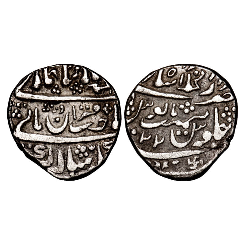 | Jaisalmir, Silver Rupee, 11.04g, Ranjit Singh (1846-1864 AD), Akhey Shahi, 22 RY Frozen, Dar ul Khilafat Shahjahanabad Mint, INO Queen Victoria, with gujarati '107' on obverse above 'Nun' of Qiran with swastik to right at extreme bottom on reverse. KM 14.2 type unlisted. Very Fine+, Rare. |