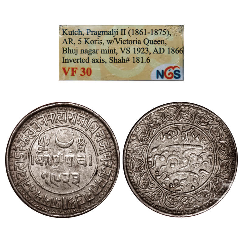 Kutch, Silver 5 Kori, Pragmalji II, INO Queen Victoria, VS 1923/1866 AD. inverted die axis. Rajgor 181.6. NGS graded VF 30, Scarce.