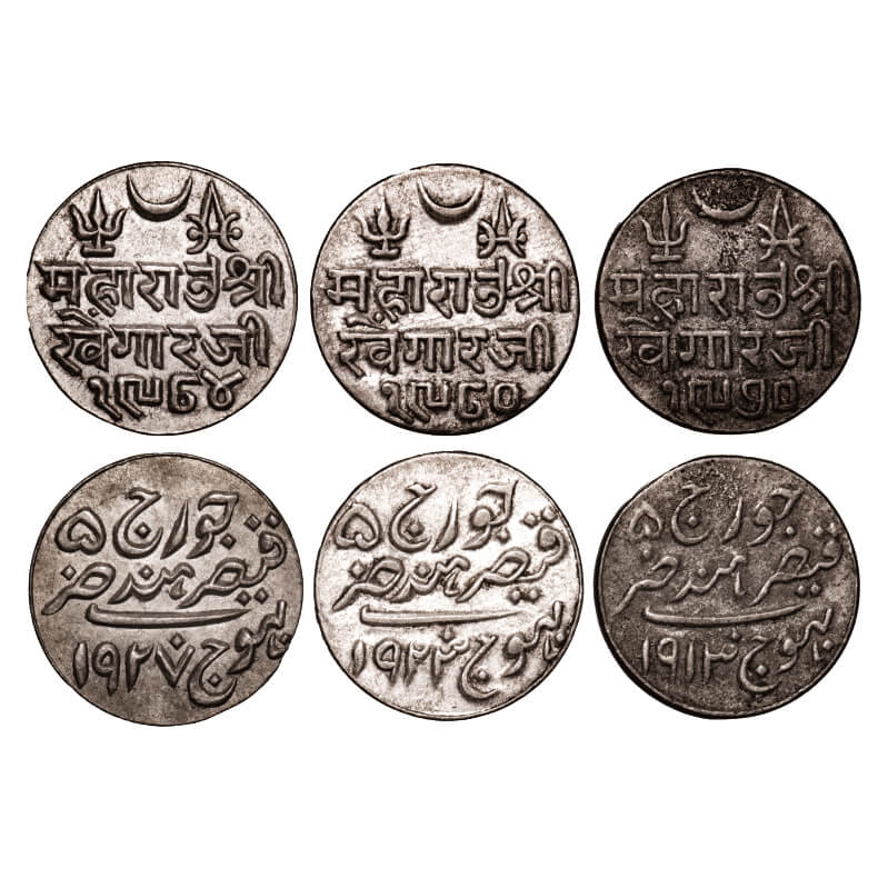 | Kutch, Silver Kori (3 Coins), Khengarji III, INO George V, VS 1970/1913, 1980/1923, 1984/1927 AD. Rajgor 230.1, 230.21, 230.29. Very Fine to Extremely Fine, Scarce. |