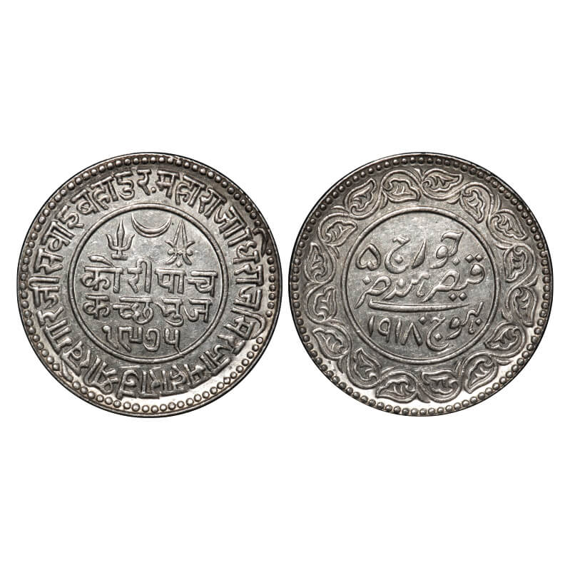 Kutch, Silver 5 Kori, 13.91g, Khengarji III, INO George V, VS 1975/1918 AD, Edge: KUTCH BHUJ reads clock wise seeing from reverse on top. Rajgor. 233.19. Almost Uncirculated, Scarce.