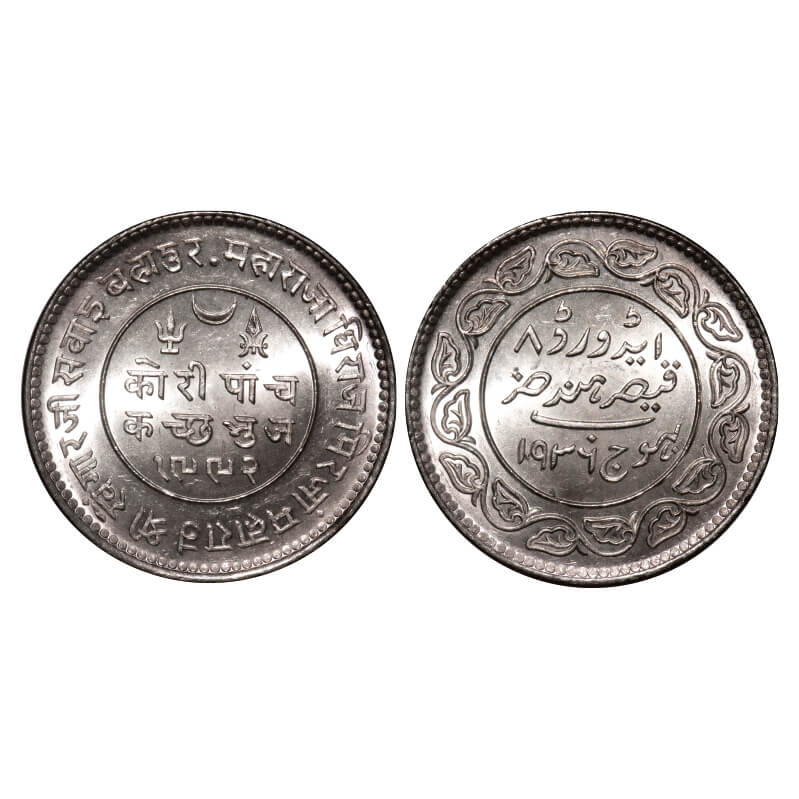 Kutch, Silver 5 Kori, 13.94g, Khengarji III, INO Edward VIII, VS 1992/1936 AD. Edge: KUTCH BHUJ reads clock wise seeing from obverse on top. Rajgor. 248.1. Brilliant Uncirculated. Scarce.