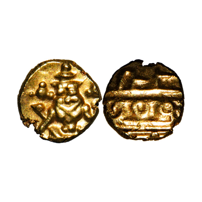 Mysore, Gold Fanam, 0.38g, Kanthirava Narasaraja Wodeyar (c. 1638-1662 AD), Obv: Narsimha seated in cross-legged posture, Rev: Crude kannada legend. K.Ganesh 14.2. Extremely Fine, Scarce.