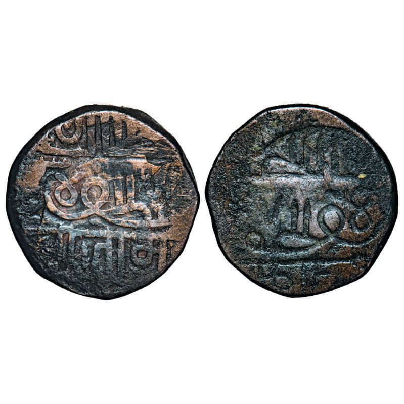 Nawanagar, Copper Dhinglo/1½ Dokda, 9.38g, Jam Vibhaji, Brockage/Lakhi, AH (9)78. Obv: Sri Jamji. KM 8, type. Very Fine, Rare.