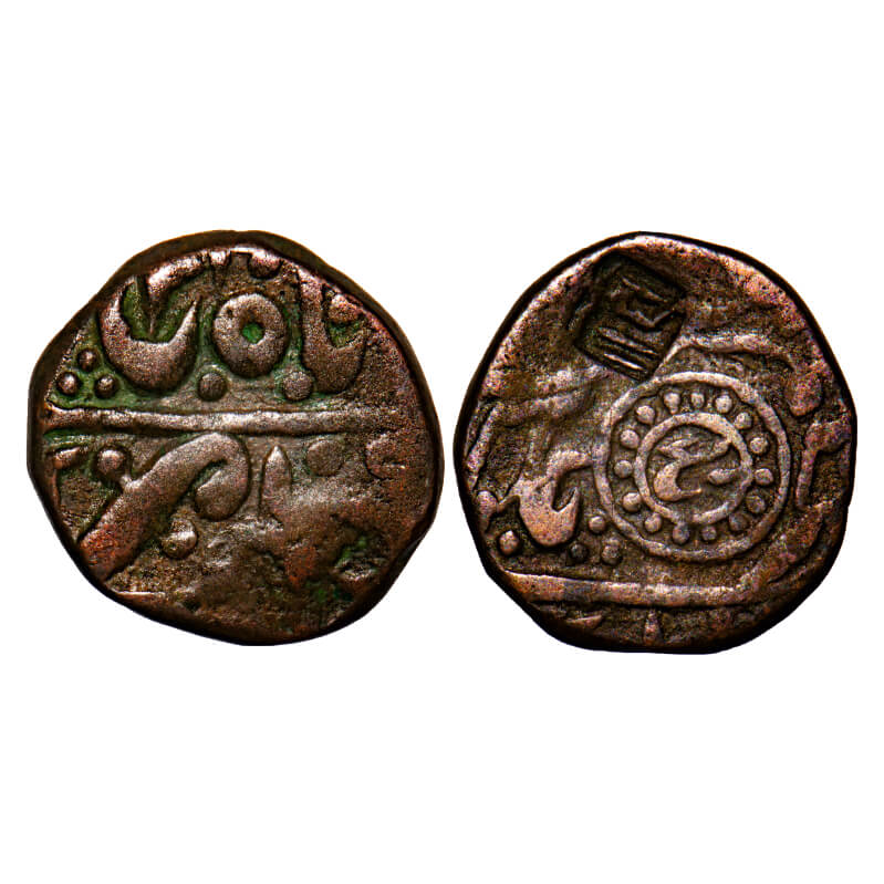 | Ratlam, Copper Paisa, 11.31g, anonymous hammered coinage, sword on obverse, with counter mark, one with clear legend Raij within double line dotted circle on reverse. Unlisted, Very Fine, Rare. |