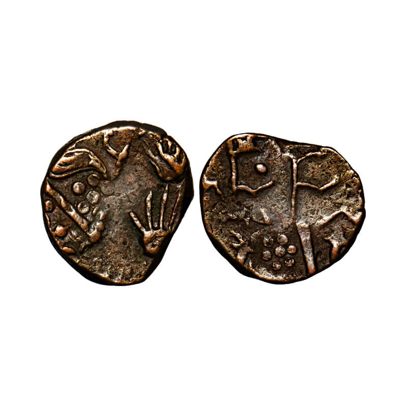 | Sunth, Copper Paisa, 6.96g, Parmar Rulers, Rampur Mint, Obv: 2 Palm, & chamar type,, Rev: ra ma ra. overstruck on rampur coin itself. Sameer Panchal # PM 376 unlisted type. Very Fine, Scarce. |