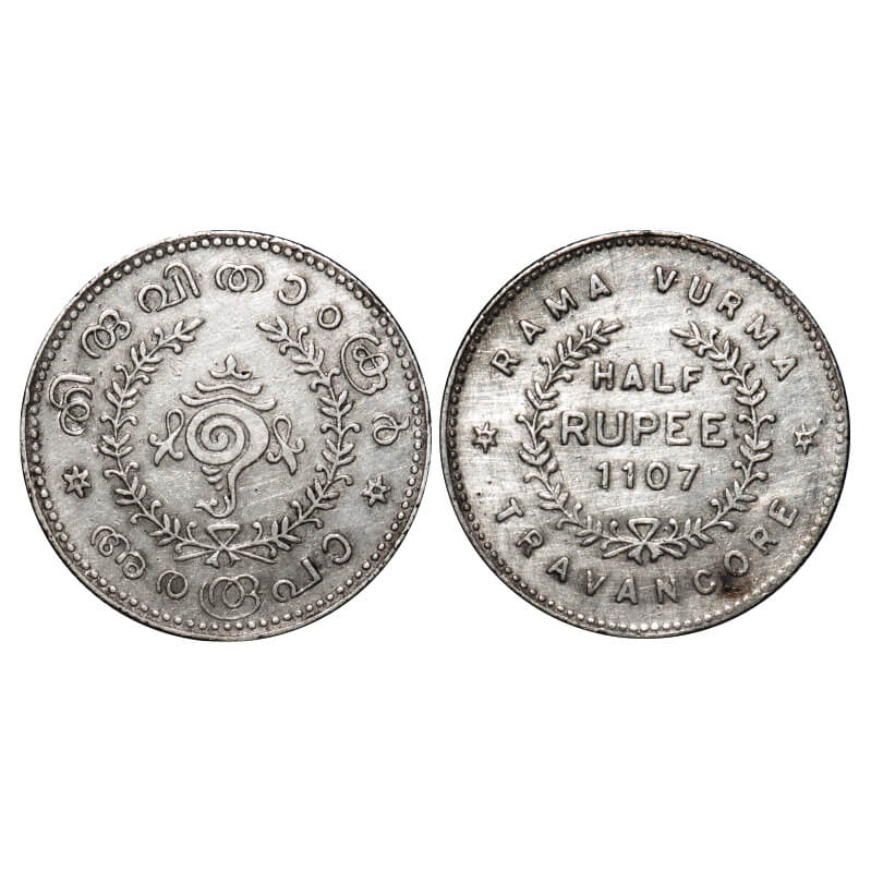 Travancore, Silver, ½ Rupee, 5.33g, Rama Varma VI (ME 1062-1101 / 1885-1924 AD), ME 1107 (1931-1932 AD). KM 53. Very Fine+, Scarce.