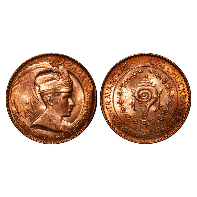 Travancore, Bronze Chuckram, 7.80g, Bala Rama Varma II (ME 1101-1126, 1924-1949 AD), Portrait Type. Cud error. KM 60. Uncirculated, Rare.