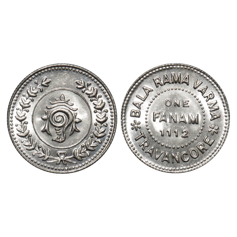 Travancore, Silver, 1 Fanam, 1.52g, Bala Rama Varma II (ME 1101-1126, 1924-1949 AD), ME 1112 (1936-1937 AD). KM 61. Brilliant Uncirculated. Very Scarce.