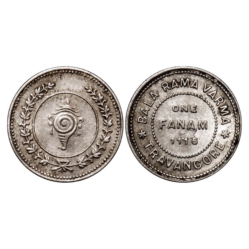 Travancore, Half Silver Fanam, 1.52g, Bala Rama Varma II (ME 1101-1126 / 1924-1949 AD), ME 1116. KM 65. Very Fine, Scarce.