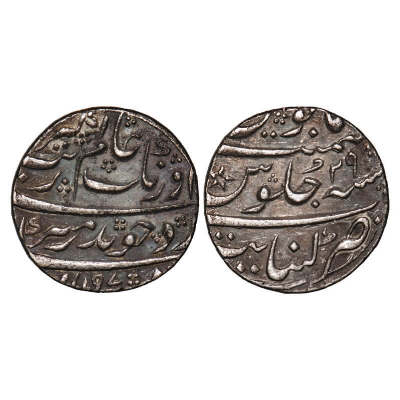 Aurangzeb, Silver Rupee, 11.43g, Khujista Buniyad Mint, AH 1116/49 RY. KM 300.52. About Very Fine, ...