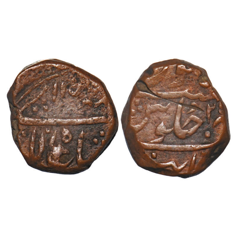 Muhammad Shah, Copper Paisa, 13.83g, Khambayat Mint, AH 1051/21 RY. KM A430.13. About Very Fine, Scarce.
