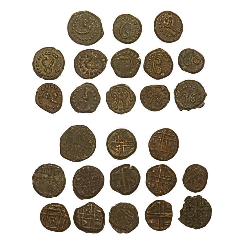 | Mysore, Copper Kasu (13 Coins), Numerals 2 (2), 3, 4, 7, 9, 12, 16, 17, 18, 23, 24, 27. KM 165 types. Fine to About Very Fine, Scarce. |