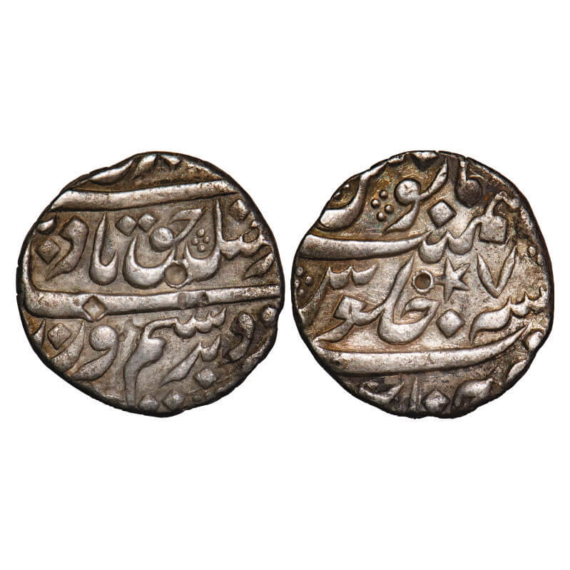 | Madras Presidency, Silver Rupee, 11.50g, (1713-1719 AD Issue), Chinnapatan Mint, AH (113)0/7 RY, INO Farrukhsiyar, Star mint mark on reverse. P.Stevens (Page 376) 2.26 / F. Prid 129 type. About Very Fine, Scarce. |