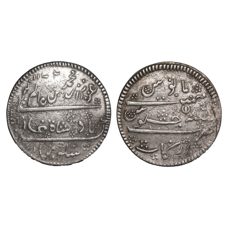 | Madras Presidency, Silver Double Rupee, 23.45g, (1807 AD First European style Issue), Arkat Mint, AH 1172/6 RY, INO Alamgir II, open lotus type, Struck on Spanish 8 Real coin (Traces Visible), All with in toothed Border on both sides. Very hard to find this types in this condition with traces of spanish Real. P.Stevens (Page 467) Unlisted Type. Very Fine, Extremely Rare. |