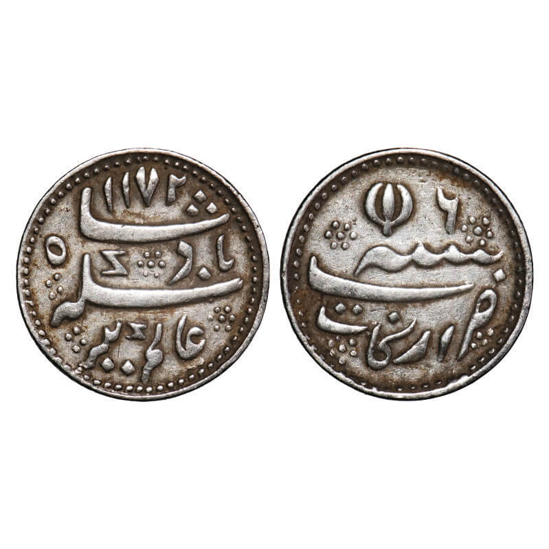 | Madras Presidency, Silver ¼ Rupee, 2.83g, (1812-1817 AD issue), Arcot Mint, AH 1172 / 6 RY, INO Alamgir II, open lotus type. P.Stevens (Page 491) 4.18 / F.Prid 255. About Extremely Fine, Scarce. |