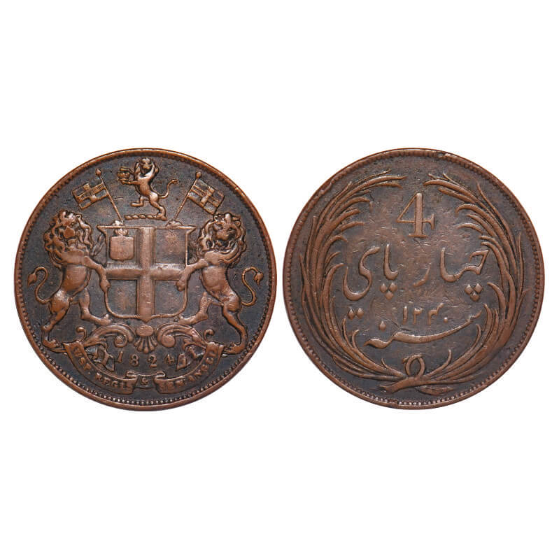 | Madras Presidency, Copper Four Pice, 8.56g, 1824 AD, struck at Royal Mint, Obv: Coat of Arms of Company & date below, Obv: The Arms of company below date, Rev: Value in Persian 'Chahar Pai' with value numeral above and Hijri Year 1240 below, All Surrounded by a Rasied Toothed Rim. (Coins of Four pies Dated 1824 are very rare than the Dates 1825). P.Stevens (Page 517) 5.87 / F.Prid 274. Very Fine, Very Scarce. |
